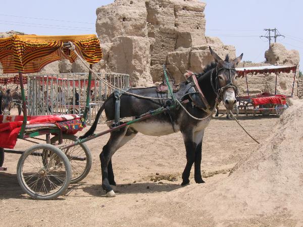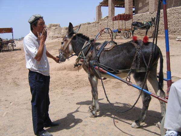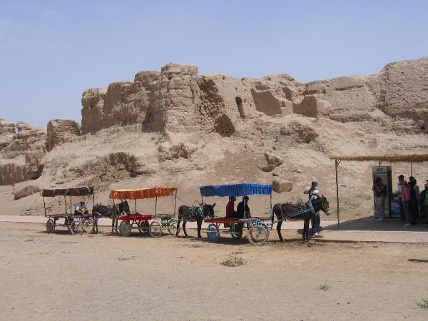 我們是坐驢車進入高昌古城的﹐ 因為是泥土路﹐ 驢子跑的時候塵灰很大﹐ 幸好導遊替我們準備了口罩,