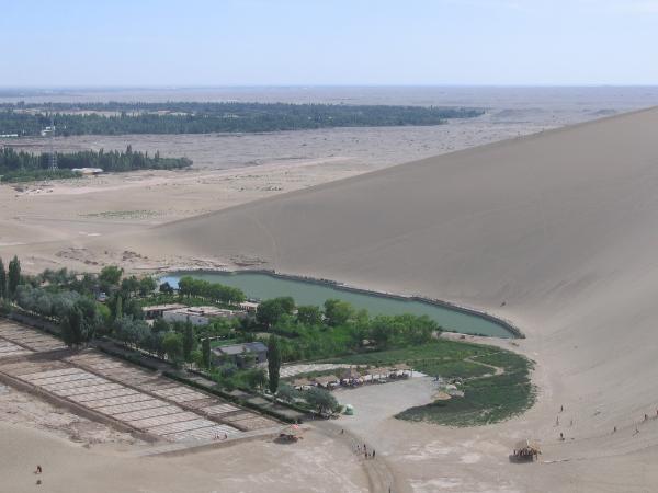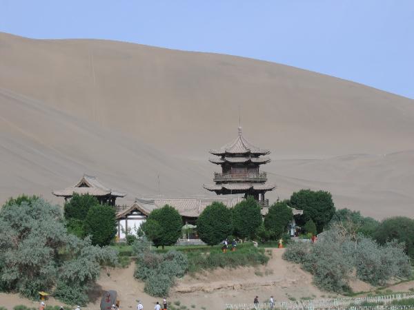 流沙與清泉往往是彼此不易共存的景物﹐ 因為沙山是會移動的﹐ 泉水很容易就會被蓋掉了﹐但在月牙泉這個地方﹐