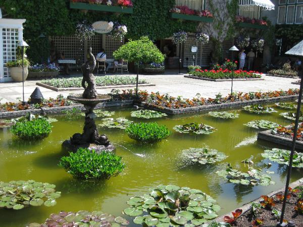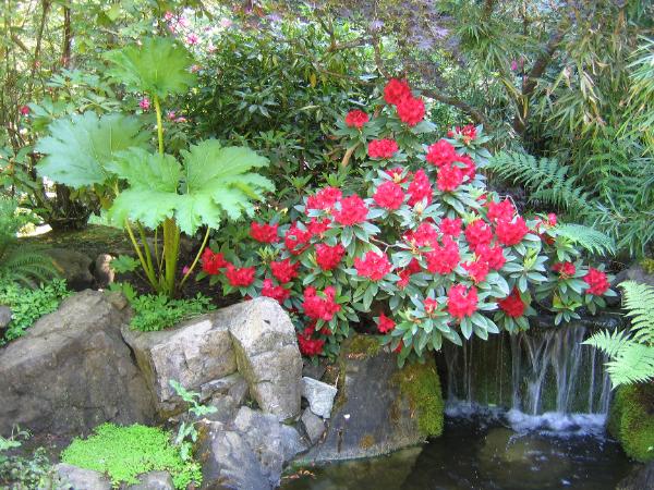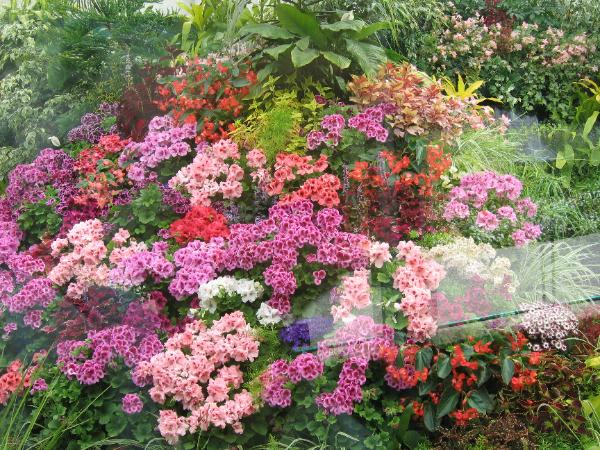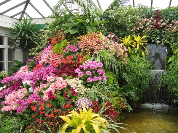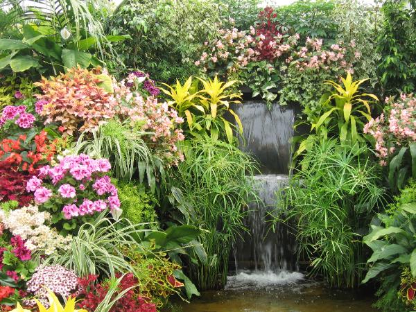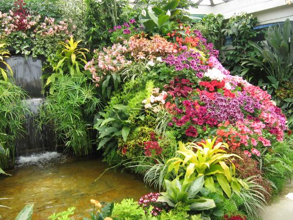 一個室內的園景佈置, 一筑筑各色的花叢配上一個小瀑布,